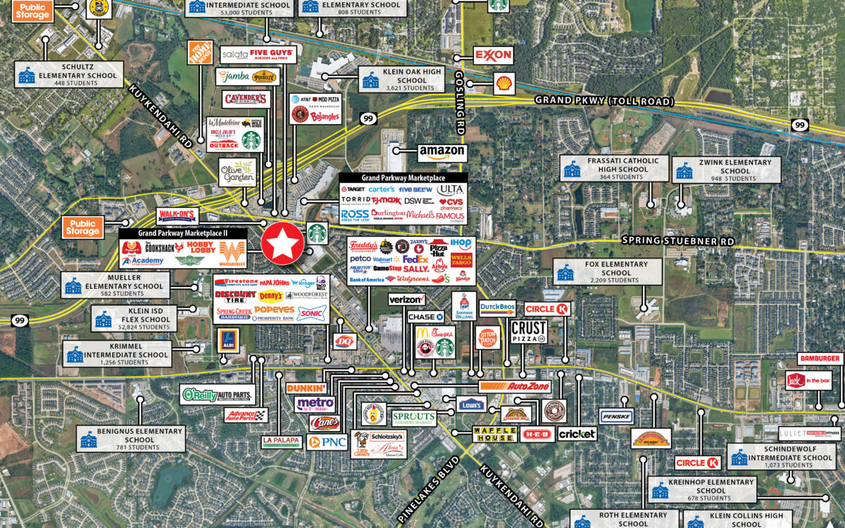 Prime Retail Location: The Property is situated on a sizable 1.79-acre parcel at the signalized entrance to Grand Parkway Marketplace I & II, which welcomed over 4.7 million visitors in the past year. Anchored by top national retailers including Target, Hobby Lobby, Academy, T.J.Maxx, Burlington, and Ross, the Marketplace stands as one of the area’s premier shopping destinations. The Property also benefits from its location within a dynamic retail corridor, adjacent to Spring Town Center and Klein Crossing. Spring Town Center is home to major anchors such as Walmart Supercenter, Cinemark, Lowe’s, and Sprouts Farmers Market, further reinforcing the area’s strong regional retail draw.