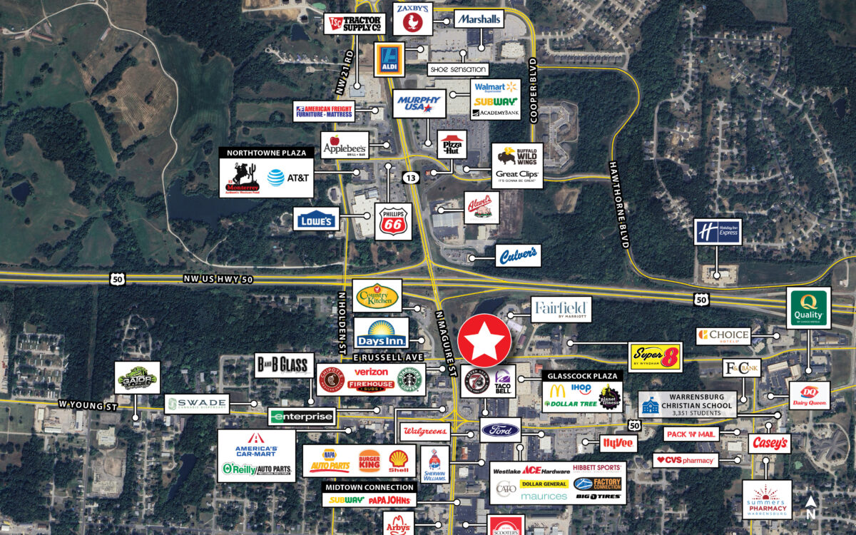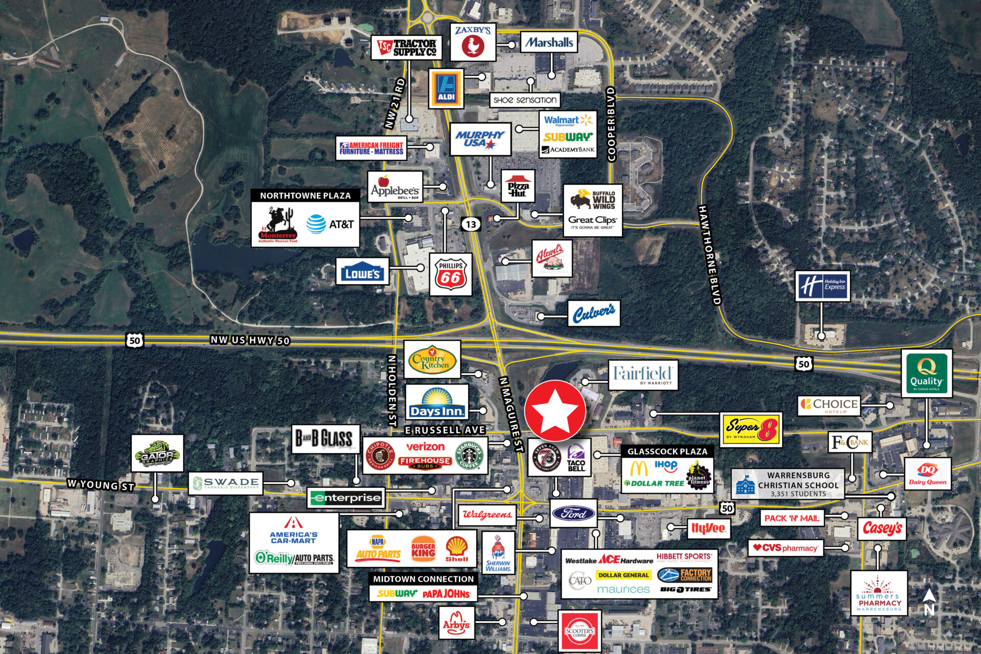 - Prime Retail Location – Positioned just off E. Russell Ave and only 0.25 miles from US Hwy 50 (25,000+ vehicles per day), the property benefits from proximity to Warrensburg’s main retail corridor. Neighboring Walmart, Lowe’s, ALDI, and Tractor Supply drive consistent traffic from a 5-mile trade area of 25,155 residents, making it a high-visibility, high-access site ideal for drive-thru coffee.