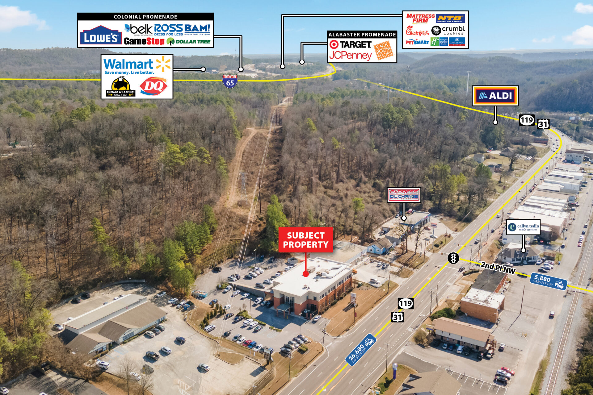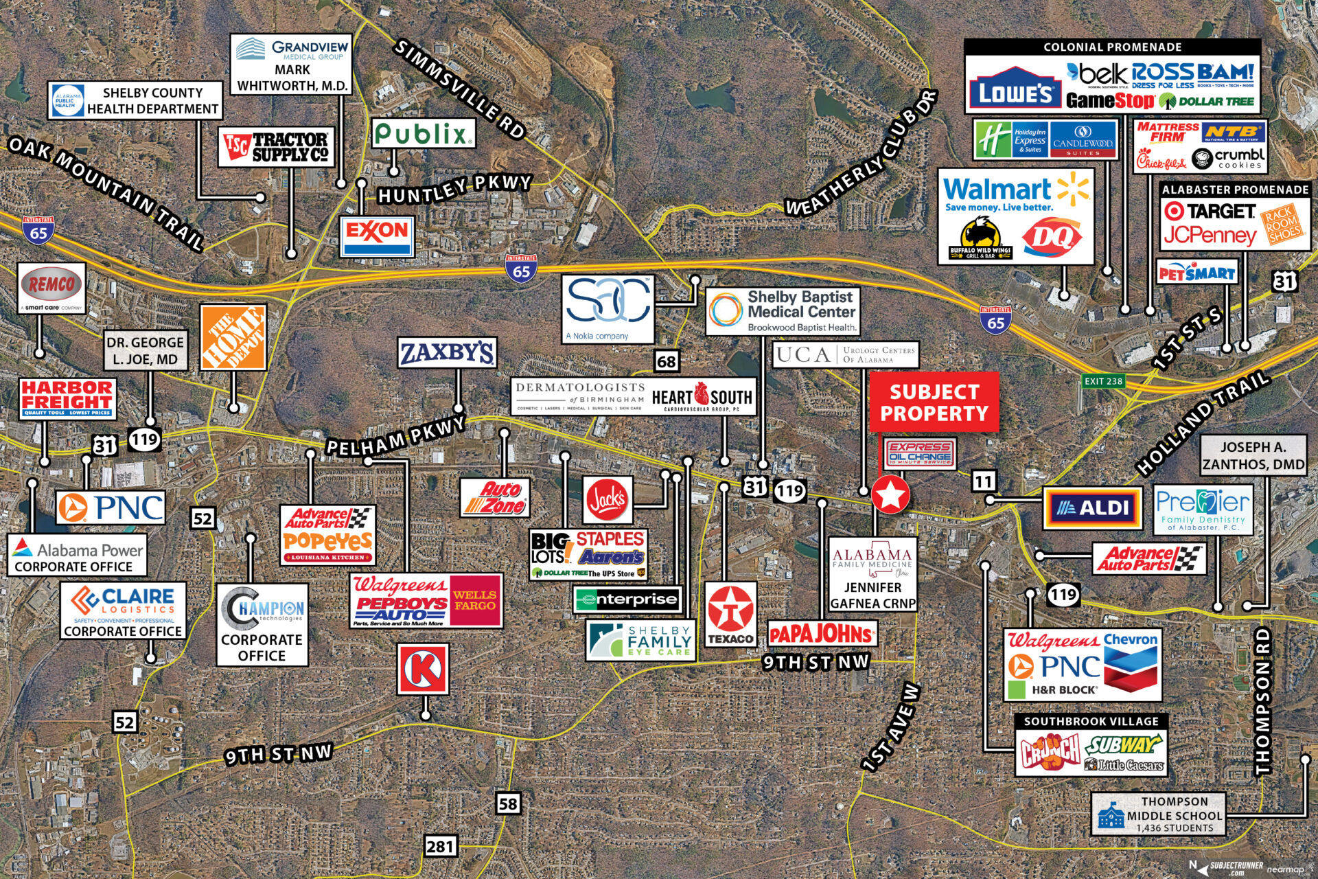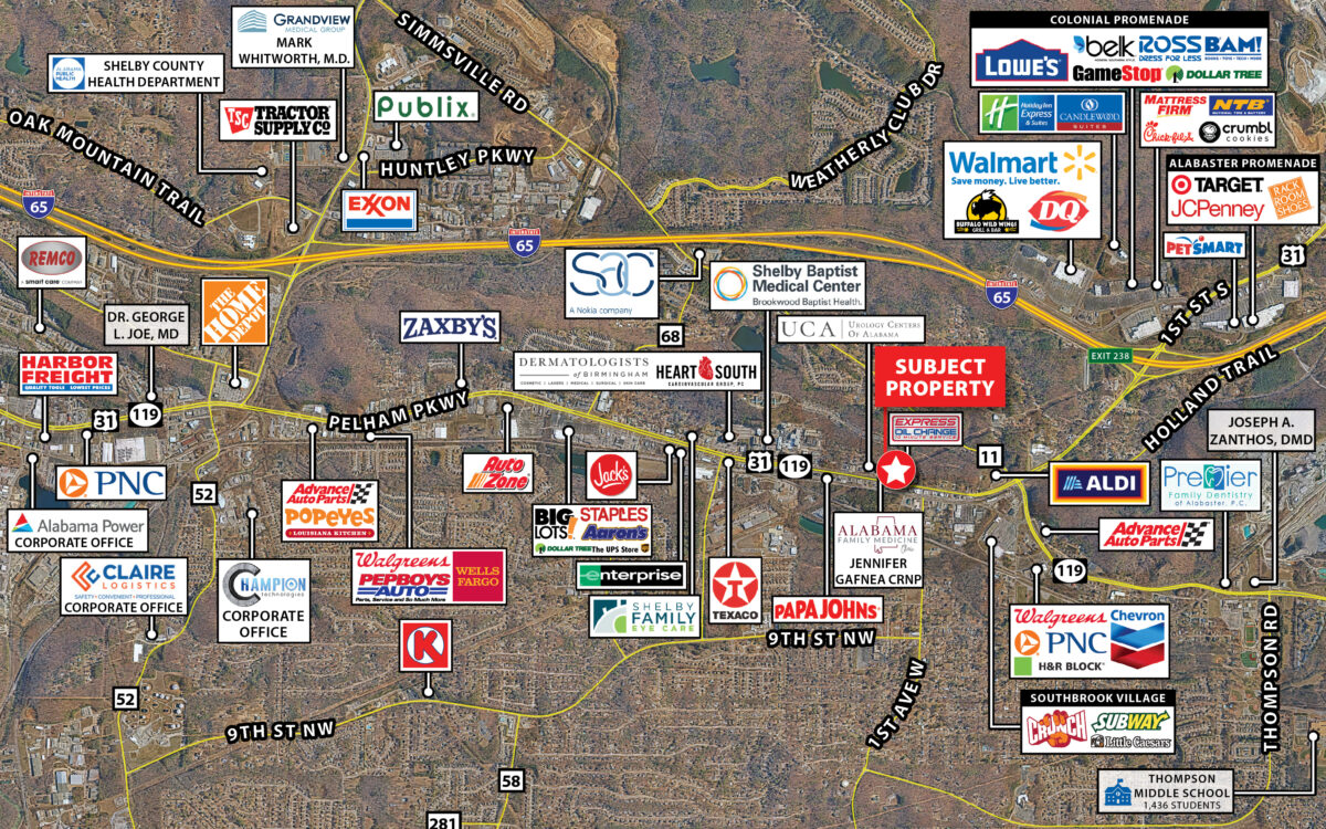 • Proximity to Major Regional Hospital Anchor: Less than one mile from Shelby Baptist Medical Center, a regional destination drawing over 51,000 patient visits annually, driving traffic and reinforcing the area’s medical ecosystem.