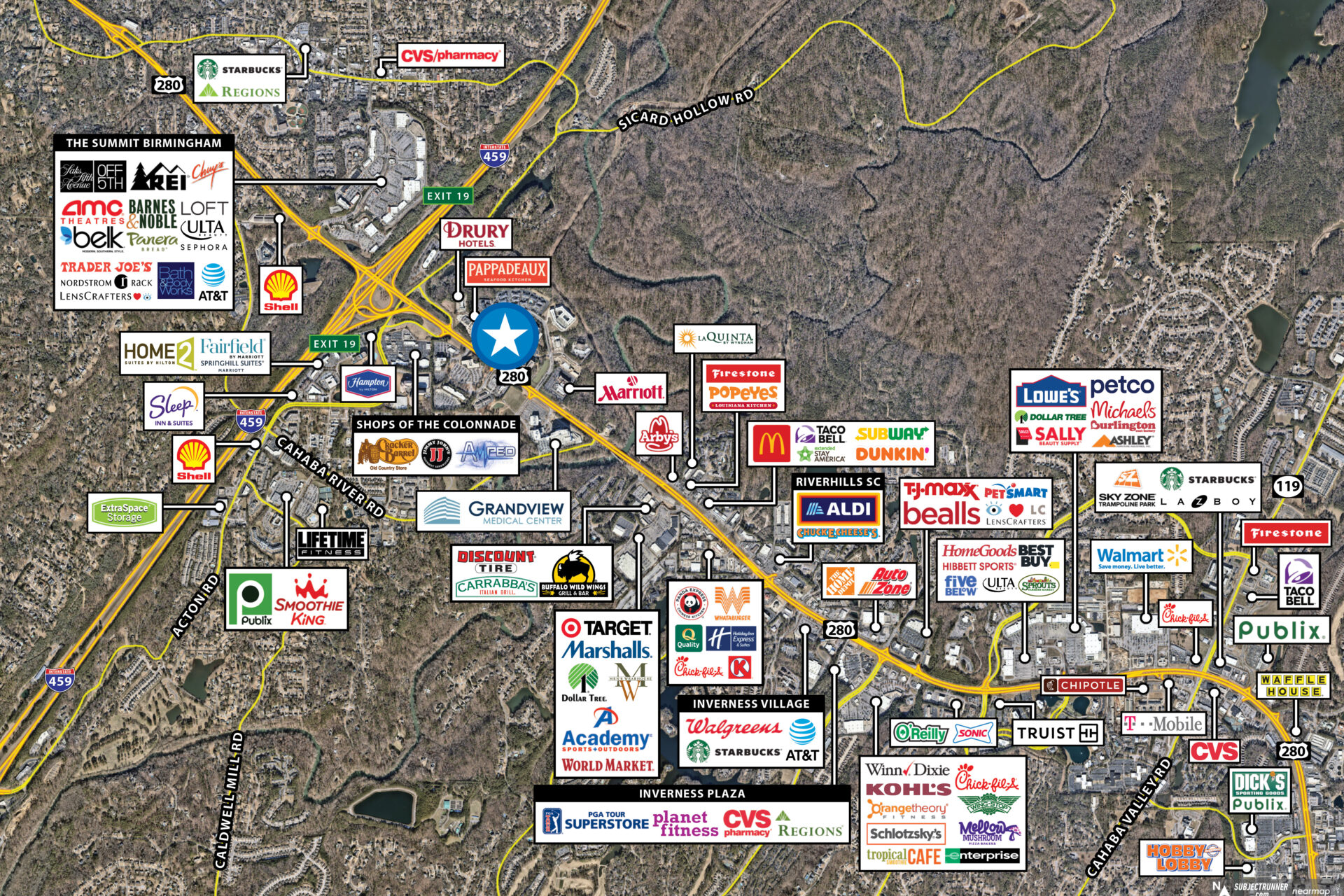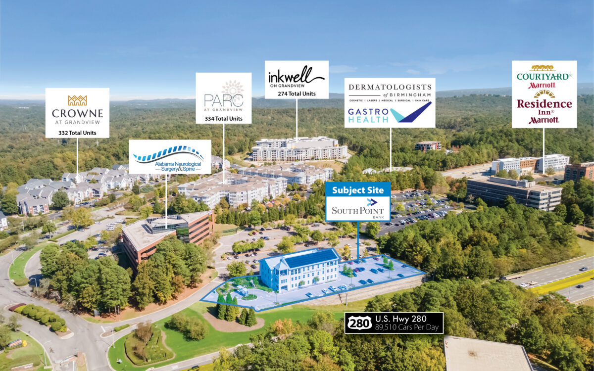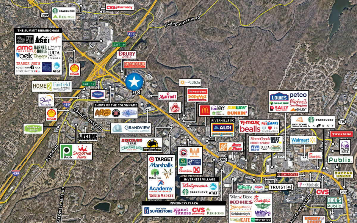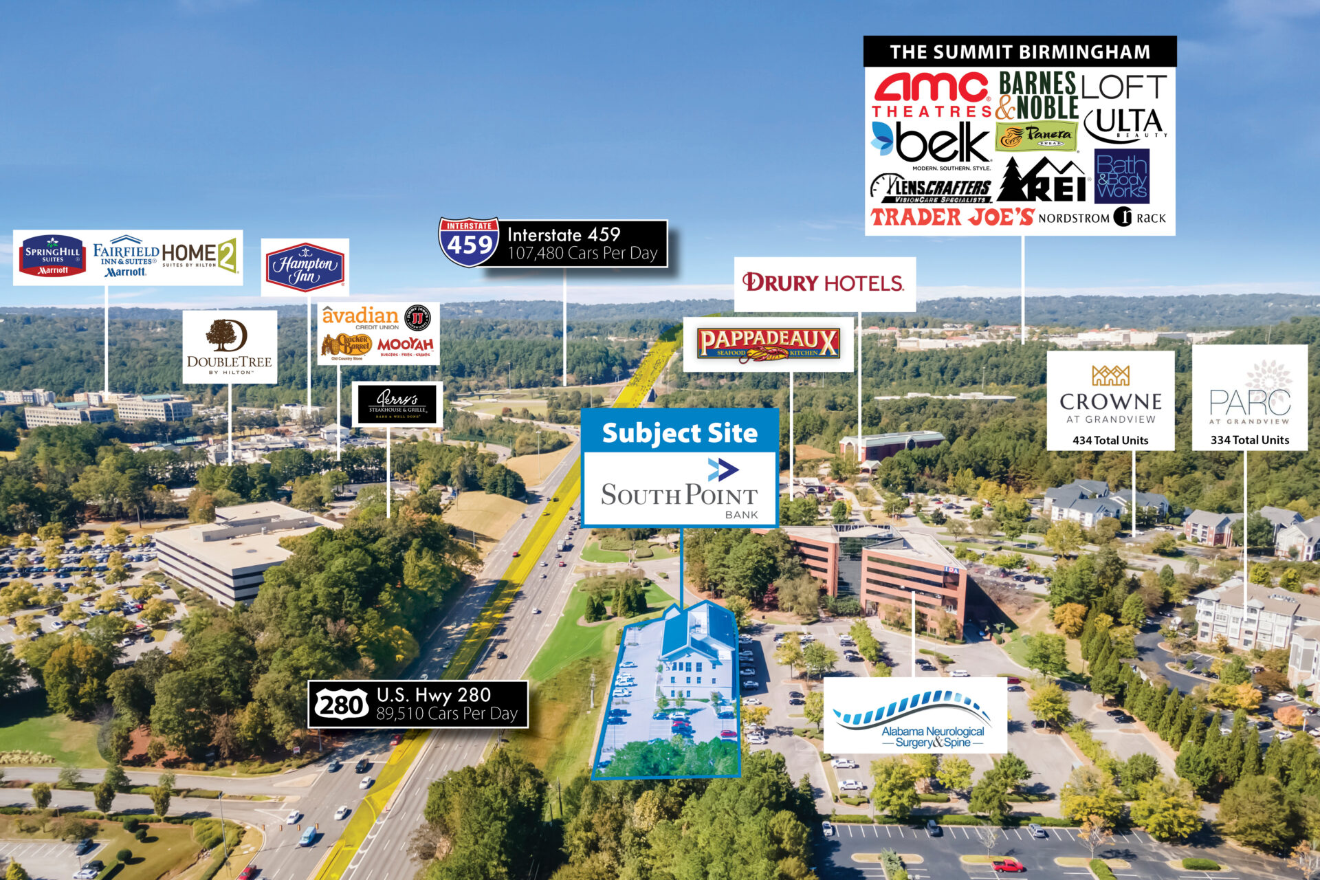 - Prime Location: Positioned along Birmingham’s primary north–south commercial corridor, U.S. Highway 280, the property benefits from exceptional visibility with traffic counts exceeding 89,500 vehicles per day. The site is conveniently located one mile from Interstate 459, offering seamless regional connectivity and access to major employment and residential hubs throughout the metro.