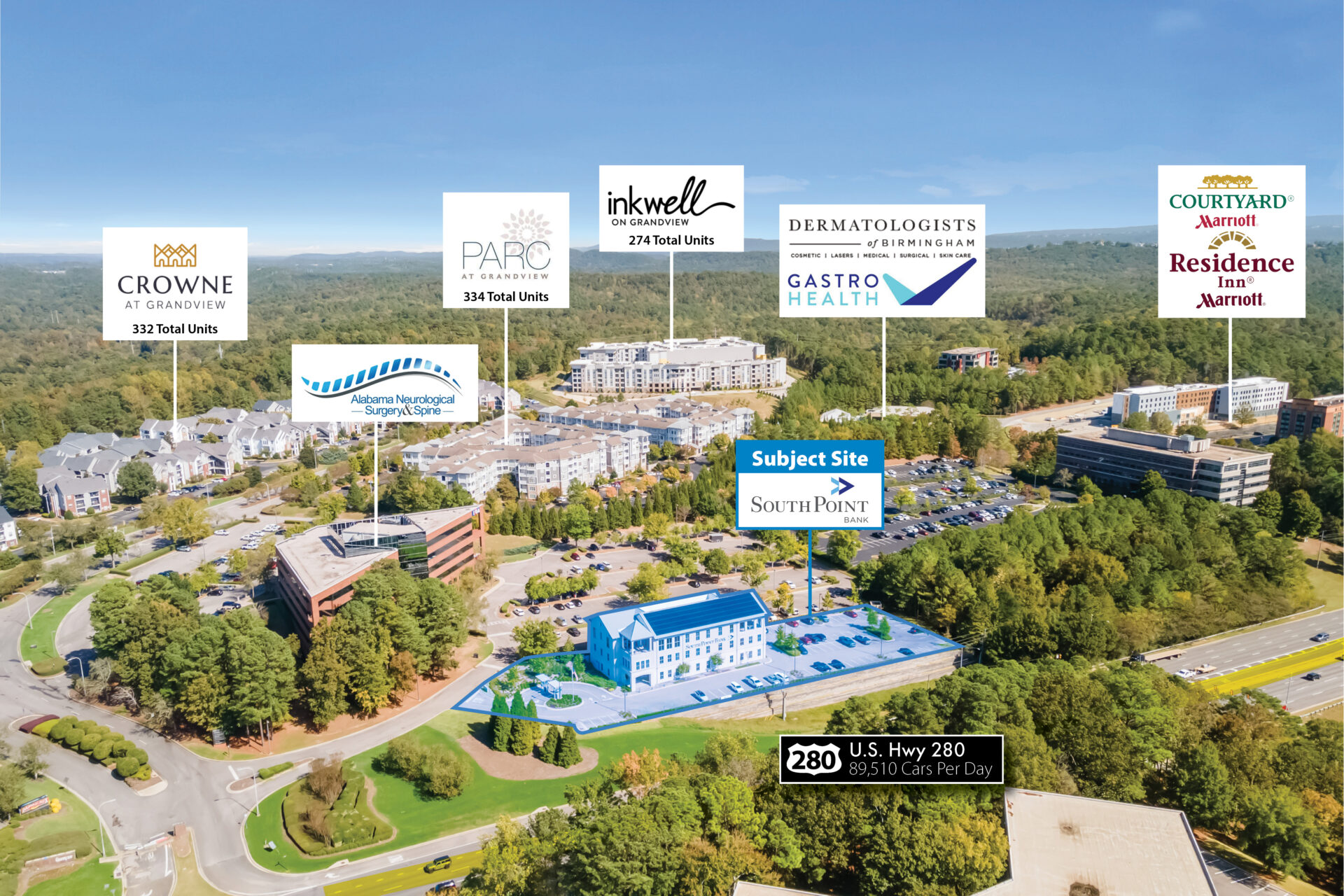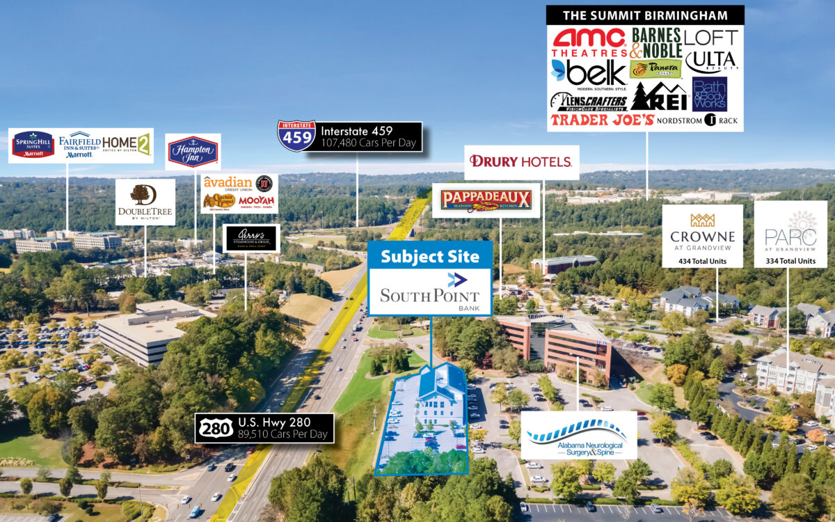 - Proximity to The Summit: Located less than two miles from The Summit, Birmingham’s premier open-air retail and lifestyle center featuring high-end national retailers, dining, and office space. This proximity enhances both daytime traffic and long-term brand visibility for SouthPoint Bank’s corporate operations.